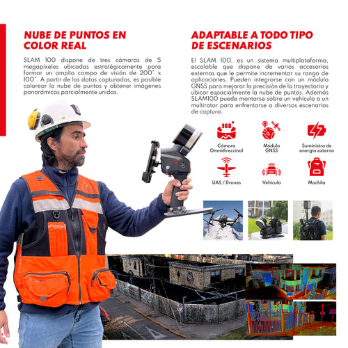DESCRIPCIÓN Adaptable para diversos escenarios SLAM 100 es el primer escáner LiDAR móvil portátil que utiliza la tecnología SLAM, lanzado por Altitude Geospatial. Este sistema incluye un cabezal giratorio de 360° que permite realizar levantamientos de nubes de puntos con una cobertura de 270°×360°. Combinado con un algoritmo SLAM de nivel industrial, puede obtener datos de nubes de puntos con alta precisión y representatividad, incluso en entornos desafiantes sin señal GNSS. CARACTERÍSTICAS SLAM100 El SLAM 100, es un sistema multiplataforma, escalable que dispone de varios accesorios externos que le permite incrementar su rango de aplicaciones. Pueden integrarse con un módulo GNSS para mejorar la precisión de la trayectoria y ubicar espacialmente la nube de puntos. Además SLAM100 puede montarse sobre un vehículo o un multirotor para enfrentarse a diversos escenarios de captura. Nube de puntos en color real SLAM 100 dispone de tres cámaras de 5 megapíxeles ubicadas estratégicamente para formar un amplio campo de visión de 200° x 100°. A partir de los datos capturados, es posible colorear la nube de puntos y obtener imágenes panorámicas parcialmente unidas. SLAM Go SLAM GO es una aplicación móvil desarrollada en conjunto con el SLAM 100. La aplicación se puede conectar al sistema a través del teléfono celular y permite gestionar proyectos, visualizar nubes de puntos en tiempo real, previsualizar imágenes, actualizar firmware y realizar otras operaciones. La aplicación es compatible con los sistemas operativos Android e iOS. SOFTWARE SLAM GO POST SLAM GO POST, integrado en UAV Manager Professional Edition, es un software para PC compatible con el SLAM 100. Este software permite realizar el postprocesamiento de los datos capturados, generar nubes de puntos en color de alta precisión y representatividad, ademas generar imágenes panorámicas parciales, visualizar nubes de puntos y llevar a cabo un procesamiento de optimización de la nube de puntos. ESPECIFICACIONES LiDAR: ⨭ Rango de captura: 120m ⨭ Tasa de captura: 320 KHz/s ⨭ Clasificación de seguridad: Clase 1 ⨭ Campo de visión: 270° x 360° ⨭ Número de canales: 16 ⨭ Exactitud relativa: + 2cm SISTEMA: ⨭ Peso /Sin batería: 1.58 Kg ⨭ Temperatura de operación: -10° a 45°C ⨭ Plataforma: Dron / Vehículo / Mochila / Mano / Jalón ⨭ Batería Interna: 3350mAh x 4 ⨭ Almacenamiento Interno: 32GB SD ⨭ Autonomía de la batería: 150 minutos ⨭ Humedad ambiental de trabajo: 85%RH CÁMARA RGB: ⨭ Campo de visión: 220° Hz x 100° Vert. ⨭ N° de cámaras: 3 ⨭ Megapíxeles: 5 MP CAPACIDADES: ⨭ Captura GNSS: si (opcional) ⨭ Captura sin luz: ✓ ⨭ Visualización tiempo real: ✓ ⨭ Nube de puntos RGB: ✓ ⨭ Formatos exportación: LAS,PLY,XYZ ⨭ Otras exportaciones: Trayectoria ⨭ Exactitud de mapeo: +5cm VIDEOS DESCARGAS DESCARGAR DATASHEET
