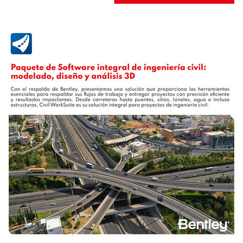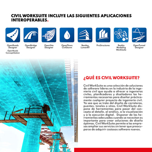 DESCRIPCIÓN Con el respaldo de Bentley, presentamos una solución que proporciona las herramientas esenciales para respaldar sus flujos de trabajo y entregar proyectos con precisión eficiente y resultados impactantes. Desde carreteras hasta puentes, sitios, túneles, agua e incluso estructuras, Civil WorkSuite es su solución integral para proyectos de ingeniería civil. Con las herramientas adecuadas justo donde las necesita, puede entregar proyectos completos con mayor eficiencia, precisión e innovación, y generar crecimiento en sus resultados. • El diseño en el contexto de la realidad • Integrar entre disciplinas • Intención de diseñar modelos y producir visualizaciones realistas • Automatizar el flujo de trabajo de generación de mallas 3D Disponible solo en suscripción anual Virtuosity CARACTERÍSTICAS BENTLEY Civil Worksuite Software para carreteras y puentes OpenRoads Designer es una aplicación de diseño civil extremadamente versátil que se utiliza para todo tipo y tamaño de proyectos civiles en todo el mundo. La aplicación aborda una amplia variedad de tareas complejas, como el diseño de distribuidores viales, el diseño de rotondas, los movimientos de tierra, la topografía, el diseño de redes sanitarias y de aguas pluviales, las utilidades del subsuelo y la generación de informes de estacado de construcción. OpenRoads ConceptStation es un software de diseño conceptual de red de carreteras. Le permite crear rápidamente diseños conceptuales durante las fases preliminares y de planeación de sus obras de infraestructura. OpenBridge Designer le permite aprovechar el modelado de información de puentes (BrIM). Gracias a las últimas tecnologías y funciones de puentes, podrá modelar, diseñar y producir proyectos entregables de forma eficaz en un entorno dinámico, interactivo y paramétrico. OpenSite Designer es una aplicación diseñada para abordar todos los aspectos del diseño del sitio, la ingeniería y el desarrollo del terreno. OpenSite Designer también incluye OpenSite SITEOPS, para que pueda identificar rápidamente las limitaciones en una fase temprana, comprender las implicaciones financieras y la viabilidad del proyecto, y producir soluciones optimizadas para satisfacer las necesidades de su cliente. Software de aguas pluviales OpenFlows Storm (Advanced) es una solución de modelado hidráulico completamente dinámica y multiplataforma desarrollada para el análisis de sistemas complejos de aguas pluviales. Puede analizar estos sistemas mediante las herramientas hidráulicas e hidrológicas integradas y una serie de métodos de calibración en clima húmedo. Software de modelado y visualización de la realidad Reality Modeling WorkSuite le ofrece acceso a las aplicaciones de modelado de realidad más populares de Bentley, iTwin Capture Modeler y ProjectWise ContextShare. LumenRT es un revolucionario software de visualización en tiempo real que le permite dar vida a sus proyectos con imágenes de calidad cinematográfica, videos y presentaciones en tiempo real de sus modelos de diseño de infraestructuras inmersos en el contexto de una naturaleza digital realista. Software estructural ProStructures es un completo software de diseño de acero y concreto que ofrece componentes estructurales paramétricos para aumentar su productividad y rentabilidad. Puede crear y actualizar automáticamente modelos en 3D de estructuras de acero, metal y concreto armado. ProStructures incluye ProSteel y ProConcrete. Software de túneles OpenTunnel Designer aumenta la productividad hasta en un 50 % y le proporciona herramientas específicas para cada trabajo. El software ayuda a eliminar repeticiones y retrasos innecesarios ya que permite a los miembros del proyecto trabajar en una aplicación fácil de usar. Intercambie información fácilmente con otras aplicaciones de Bentley, como Leapfrog, PLAXIS, OpenRoads, OpenRail, OpenBridge y ProStructures, para disponer de un flujo de trabajo unificado para el análisis, el diseño y el rendimiento. ESPECIFICACIONES ⨭ El paquete incluye los siguientes software: • OpenRoads Designer • OpenRoads ConceptStation • OpenBridge Designer • OpenSite Designer • OpenFlows CivilStorm • Bentley LumenRT • ProStructures • Reality Modeling WorkSuite • OpenTunnel Designer