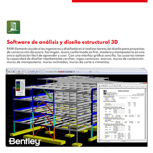 DESCRIPCIÓN RAM Elements ayuda a los ingenieros y diseñadores a realizar tareas de diseño para proyectos de construcción de acero, hormigón, acero conformado en frío, madera y mampostería en una única aplicación fácil de aprender y usar. Con una interfaz gráfica sencilla, los usuarios tienen la capacidad de diseñar rápidamente cerchas, vigas continuas, marcos, muros de contención, muros de mampostería, muros inclinados, muros de corte o cimientos. Disponible en versión perpetua y suscripción anual Virtuosity CARACTERÍSTICAS BENTLEY RAM Elements • Realice análisis y diseño, incluido el análisis de elementos finitos en 3D RAM Elements ayuda a los ingenieros y proyectistas a realizar tareas de diseño para proyectos de construcción en acero, hormigón, acero conformado en frío, tablero de madera y mampostería dentro de una única aplicación fácil de aprender y usar. Con una interfaz gráfica sencilla, los usuarios tienen la capacidad de diseñar rápidamente celosías, vigas continuas, pórticos, muros de contención, muros de mampostería, muros tilt-up, muros de cortante o cimentaciones. • Agilice su trabajo con una sola aplicación de software RAM Elements ofrece diseños y análisis de elementos finitos completamente en 3D, junto a módulos de diseño independientes o integrados, todo en un paquete fácil de usar, de manera que no es necesario aprender diferentes programas para diseñar acero, hormigón, mampostería, madera o acero conformado en frío, ni se requiere comprar productos adicionales para proyectos especializados como muros de contención o muros tilt-up. • Diseñe modelos estructurales completos fácilmente Incluso en los proyectos más complejos, realice las tareas de modelado de manera más rápida y sencilla con las funciones de modelado que ofrecen una mayor flexibilidad. Aproveche el entorno de escritorio personalizable para acceder fácilmente a los comandos de uso más habitual. RAM Elements ofrece características para el modelado de componentes físicos que le permiten diseñar como un ingeniero sin ser un especialista en elementos finitos. Diseñe componentes como parte de su modelo de elementos finitos 2D o 3D sin esfuerzo, incorporando toda la información al módulo de diseño automáticamente. Realice todas las comprobaciones de diseño necesarias, incluida la elaboración de planos completos, informes precisos y especificaciones de detalles de armadura. • Personalice su trabajo Modele de forma rápida y precisa con características personalizables y cumpla con los estándares de su empresa. Personalice las barras de herramientas, las vistas del modelo, las opciones de visualización y los sistemas de unidades, y cree fácilmente plantillas para que sea más fácil replicarlas en sus estructuras de diseño diarias y pueda ahorrar tiempo en cada proyecto. ESPECIFICACIONES ⨭ Análisis dinámico (valores propios y espectros de respuesta) con métodos CQC, SRSS y ABS para superposición e iteración de subespacios, vectores de Ritz y Lanczos/Arnoldi para análisis de valores propios ⨭ Análisis iterativo no lineal P-Delta ⨭ Análisis de pandeo lineal (iteración Lanczos/Arnoldi o subespacial) ⨭ Importación de DXF, STAAD.Pro, RAM Structural System, OpenRE y SAP2000 así como integración completa con Structural Synchronizer (ISM) Exportación a DXF, SDNF, OpenRE y RAM SBeam VIDEOS DESCARGAS Descargar Datasheet