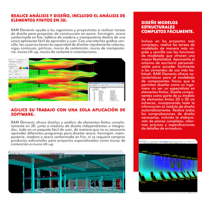 DESCRIPCIÓN RAM Elements ayuda a los ingenieros y diseñadores a realizar tareas de diseño para proyectos de construcción de acero, hormigón, acero conformado en frío, madera y mampostería en una única aplicación fácil de aprender y usar. Con una interfaz gráfica sencilla, los usuarios tienen la capacidad de diseñar rápidamente cerchas, vigas continuas, marcos, muros de contención, muros de mampostería, muros inclinados, muros de corte o cimientos. Disponible en versión perpetua y suscripción anual Virtuosity CARACTERÍSTICAS BENTLEY RAM Elements • Realice análisis y diseño, incluido el análisis de elementos finitos en 3D RAM Elements ayuda a los ingenieros y proyectistas a realizar tareas de diseño para proyectos de construcción en acero, hormigón, acero conformado en frío, tablero de madera y mampostería dentro de una única aplicación fácil de aprender y usar. Con una interfaz gráfica sencilla, los usuarios tienen la capacidad de diseñar rápidamente celosías, vigas continuas, pórticos, muros de contención, muros de mampostería, muros tilt-up, muros de cortante o cimentaciones. • Agilice su trabajo con una sola aplicación de software RAM Elements ofrece diseños y análisis de elementos finitos completamente en 3D, junto a módulos de diseño independientes o integrados, todo en un paquete fácil de usar, de manera que no es necesario aprender diferentes programas para diseñar acero, hormigón, mampostería, madera o acero conformado en frío, ni se requiere comprar productos adicionales para proyectos especializados como muros de contención o muros tilt-up. • Diseñe modelos estructurales completos fácilmente Incluso en los proyectos más complejos, realice las tareas de modelado de manera más rápida y sencilla con las funciones de modelado que ofrecen una mayor flexibilidad. Aproveche el entorno de escritorio personalizable para acceder fácilmente a los comandos de uso más habitual. RAM Elements ofrece características para el modelado de componentes físicos que le permiten diseñar como un ingeniero sin ser un especialista en elementos finitos. Diseñe componentes como parte de su modelo de elementos finitos 2D o 3D sin esfuerzo, incorporando toda la información al módulo de diseño automáticamente. Realice todas las comprobaciones de diseño necesarias, incluida la elaboración de planos completos, informes precisos y especificaciones de detalles de armadura. • Personalice su trabajo Modele de forma rápida y precisa con características personalizables y cumpla con los estándares de su empresa. Personalice las barras de herramientas, las vistas del modelo, las opciones de visualización y los sistemas de unidades, y cree fácilmente plantillas para que sea más fácil replicarlas en sus estructuras de diseño diarias y pueda ahorrar tiempo en cada proyecto. ESPECIFICACIONES ⨭ Análisis dinámico (valores propios y espectros de respuesta) con métodos CQC, SRSS y ABS para superposición e iteración de subespacios, vectores de Ritz y Lanczos/Arnoldi para análisis de valores propios ⨭ Análisis iterativo no lineal P-Delta ⨭ Análisis de pandeo lineal (iteración Lanczos/Arnoldi o subespacial) ⨭ Importación de DXF, STAAD.Pro, RAM Structural System, OpenRE y SAP2000 así como integración completa con Structural Synchronizer (ISM) Exportación a DXF, SDNF, OpenRE y RAM SBeam VIDEOS DESCARGAS Descargar Datasheet