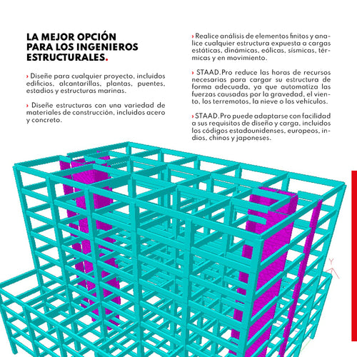 DESCRIPCIÓN STAAD es una aplicación integral de análisis y diseño de elementos finitos estructurales que le proporciona potentes capacidades de visualización y una amplia gama de códigos de diseño internacionales. Las potentes capacidades de análisis de STAAD le permiten realizar análisis en cualquier estructura expuesta a cargas estáticas, dinámicas, eólicas, sísmicas, térmicas y en movimiento. Disponible en versión perpetua y suscripción anual Virtuosity CARACTERÍSTICAS BENTLEY Staad Debido a que cada empresa tiene necesidades diferentes, existen tres variantes flexibles de STAAD: • STAAD.Pro STAAD es una popular aplicación de análisis estructural conocida por sus funciones de análisis, diversas aplicaciones de uso, interoperabilidad y ahorro de tiempo. STAAD ayuda a los ingenieros estructurales a realizar análisis y diseños estructurales 3D tanto para estructuras de acero como de concreto. Un modelo físico creado en el software de diseño estructural puede transformarse en un modelo analítico para el análisis estructural. Muchos estándares de código de diseño se incorporan en STAAD para asegurarse de que el diseño estructural cumpla con las regulaciones locales. • STAAD.Pro Advanced STAAD.Pro Advanced incluye todas las funciones de modelado, análisis, diseño e interoperabilidad de STAAD.Pro, pero añade análisis más avanzados, así como diseño de concreto armado y funciones de detallado. - Análisis geométrico no lineal y de cable - Análisis de pandeo Eigen - Análisis del espectro de suelos debido a la carga en función del tiempo (diseño sísmico) - Rendimiento dinámico de estado estacionario para diseño de vibración - Análisis pushover - Diseño y detalle de vigas, columnas, cimientos, cabezales de pilote, muros y bloques de concreto armado - Informes de diseño, inventarios de materiales y lista de cantidades - Planos, detalles y cronogramas de refuerzo automatizados con ajustes personalizables • Structural WorkSuite Structural WorkSuite es el conjunto más completo de software estructural de Bentley agrupado en una licencia asequible. Incluye todo lo que hay en STAAD.Pro Advanced y STAAD Foundation Advanced, así como varios programas RAM. Structural WorkSuite incluye el siguiente software interoperable: - STAAD.Pro Advanced - STAAD Advanced Concrete Design - STAAD Foundation Advanced - RAM Structural System - RAM Concept (incluido el postensado) - RAM Connection y RAM Elements - iTwin Analytical Synchronizer y Microstran.Advanced ESPECIFICACIONES ⨭ C apacidades gráficas. Se pueden crear modelos de forma rápida y precisa utilizando cuadrículas estructurales, información sobre herramientas para resaltar datos, generadores de marcos y un asistente de estructuras para marcos estructurales estándar. ⨭ Nuevo editor de estilo IDE avanzado con IntelliSense, integración de bases de datos y ayuda sensible al contexto ⨭ Capacidades de creación de mallas. Mallas triangulares o cuadriláteras creadas a partir de zonas dentro de modelos definidos o importadas desde archivos DXF ⨭ Generadores de carga. Sísmica UBC| IBC| ASME viento y nieve| carga de puentes BEAVA ⨭ Interfaz personalizable con herramientas VBA. Cree ventanas y tablas según sus propias especificaciones. Generador de consultas SQL ⨭ STAAD Building Planner. Entorno de modelado especial para estructuras de edificios. Operaciones como definir geometría o realizar cambios en las especificaciones geométricas son cuestión de unos pocos clics en este flujo de trabajo. VIDEOS DESCARGAS Descargar Datasheet
