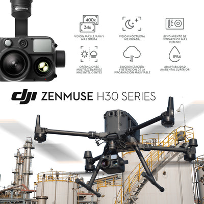 DESCRIPCIÓN La serie Zenmuse H30 es la nueva cámara de inspección avanzada para los drones DJI Matrice 300 RTK (con RC Plus) y DJI Matrice 350 RTK. Esta cámara multisensor integra cinco módulos principales: una cámara Gran Angular, una cámara Zoom, un telémetro láser, una luz NIR Auxiliar y un sensor Termal (este último integrado en Zenmuse H30T). Tanto la H30T como la H30 son cargas útiles diseñadas para todo tipo de climas, incluso para las condiciones más adversas de operación. Mediante innovadores algoritmos inteligentes, La serie H30 revoluciona los estándares de percepción y de imagen, trascendiendo las limitaciones de la visión, tanto de día como de noche. Por lo mismo, puede realizar fácilmente una amplia variedad de operaciones, que incluyen seguridad pública, inspecciones de infraestructuras en energía, conservación de agua y gestión forestal. CARACTERÍSTICAS ZENMUSE H30 Series Visión más lejana y más nítida La Serie Zenmuse H30 cuenta con una cámara con zoom de 40 MP de alta resolución que ofrece zoom óptico hasta 34× y zoom digital hasta 400×. En comparación con la generación anterior H20 Series, no solo observa a los objetivos desde mayores distancias, también captura más detalles. Con el último algoritmo de estabilización, la H30 puede reducir eficazmente los temblores del metraje del teleobjetivo, para ofrecer imágenes estables y nítidas para inspecciones detalladas de líneas de alta tensión. El telémetro ofrece un rango hasta 2.5 veces mayor que en la generación anterior H20, para capturar con precisión la información de la posición de los objetivos en un rango de 3 a 3000 m, que incluye la distancia lineal desde la cámara, la altitud y las coordenadas GPS. Visión nocturna mejorada Cuando hay poca luz, tanto la cámara con zoom como la gran angular de la Serie Zenmuse H30 pueden cambiar al modo Escena nocturna para mejorar la calidad de la vista en directo, como también la grabación. Esto asegura precisión y eficiencia operativa por la noche para permitir operaciones ininterrumpidas del día a la noche. En el modo Escena nocturna, la Serie Zenmuse H30 admite luz IR para mejorar las imágenes infrarrojas e iluminación NIR. Cuando se activa la luz NIR auxiliar, la cámara con zoom puede aprovechar la iluminación NIR adicional, lo que es especialmente útil para operaciones de vigilancia nocturna encubierta y de búsqueda y rescate. Rendimiento termal mejorado El sensor térmico infrarrojo de la H30T ofrece una resolución de 1280×1024, que cuadruplica a la H20T, con zoom digital hasta 32×. Esto permite disponer tanto de una vista general de toda la escena como de la capacidad de hacer zoom en áreas específicas. En niveles de zoom más altos, la Zenmuse H30T activa automáticamente una función de imagen infrarroja UHR (resolución ultra alta), que garantiza que las imágenes infrarrojas se mantengan nítidas. La Zenmuse H30T dispone de tres modos de ganancia de infrarrojos: el modo de alta ganancia para una medición de temperatura más precisa, el modo de baja ganancia para un mayor rango de medición de temperatura y el nuevo modo de alta resolución, que es especialmente útil para observar objetos, personas o animales con pequeñas diferencias de temperatura, lo que lo hace muy práctico para operaciones de seguridad, emergencia y búsqueda y rescate. Operaciones multiescenario más inteligentes En el modo Captura inteligente, las cámaras con zoom y gran angular de la Serie Zenmuse H30 calculan automáticamente el brillo de la luz ambiental y el rango dinámico, y aplican algoritmos de imagen inteligentes. Esto garantiza fotos con transiciones naturales entre luces y sombras, y ricos detalles, incluso en entornos con alta dinámica, luz intensa o luz tenue. Cuando hay mucha polución o la humedad atmosférica es alta, la cámara con zoom de la Serie Zenmuse H30 utiliza una nueva función de desempañamiento electrónico para aumentar la nitidez de la imagen. Ofrece niveles altos y bajos de desempañamiento para adaptarse a distintos entornos y requerimientos operativos. Adaptabilidad ambiental superior Con un índice IP54 de resistencia al polvo y al agua, la Serie Zenmuse H30 puede funcionar de forma segura y fiable, incluso en condiciones operativas adversas. Además, está diseñada para funcionar en un rango de temperatura de −20 a 50 °C (−4 a 122 °F), lo que permite cubrir las necesidades operativas en todo tipo de climas. ESPECIFICACIONES Visión más lejana y más nítida ⨭ Zoom óptico hasta 34× y zoom digital hasta 400× ⨭ Imágenes de teleobjetivo más estables ⨭ Telémetro láser a 3000 m máx. Visión nocturna mejorada ⨭ Permite visión nocturna a todo color ⨭ Permite visión nocturna en blanco y negro e iluminación NIR Rendimiento de infrarrojos más potente ⨭ Resolución en 1280×1024 ⨭ Modo de alta resolución para observación precisa ⨭ Zoom simultáneo para cámaras de visión e infrarroja ⨭ Rango de medición de temperatura de −20 a 1600 °C (−4 a 2912 °F) Sincronización y retención más fiable de la información ⨭ Admite pregrabación ⨭ Codificación de archivos y de transmisión con borrado de registros con solo un clic ⨭ Sincronización de la información en la nube para la cooperación aire-tierra Operaciones multiescenario más inteligentes ⨭ Captura inteligente para mejorar las imágenes ⨭ Desempañamiento electrónico Adaptabilidad ambiental superior ⨭ Protección de ingreso IP54 ⨭ Temperatura de funcionamiento de −20 a 50 °C (−4 a 122 °F) VIDEOS DESCARGAS Descargar Datasheet