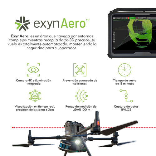 DESCRIPCIÓN Aprendizaje automático para adaptarse a prácticamente cualquier aplicación industrial ExynAero, es un sistema móvil montado en dron para vuelos en entornos complejos, sin GNSS. Recopila información geoespacial de forma precisa, realizando vuelos totalmente automatizados, manteniendo la seguridad para su operador y su entorno. Pilotado por ExynAI (sitema de inteligencia artificial), ExynAero analiza su entorno e identifica la ruta de vuelo más segura y eficiente. Con toda la inteligencia a bordo, el ExynAero vuela más allá de la línea de visión, fuera del alcance de las comunicaciones y sin soluciones GNSS. La exploración del vuelo, puede ser visualizada en tiempo real, a través de la interface ExynView instalada en una tablet, con esto el operador puede asegurar haber capturado todo lo necesario del sitio a medir. El sistema de piloto automatizado ExynAI, emplea múltiples modalidades de detección de obstrucciones (como LiDAR, sensores inerciales y el algoritmo SLAM). Los robots Exyn reconocen objetos estáticos y en movimiento, mantienen una distancia segura para evitar colisiones y condiciones variables como polución, falta de iluminación, cables o personas, todo en tiempo real. CARACTERÍSTICAS AERONAVE ⨭ Modelo DJI M300 RTK ⨭ Dimensiones 883 x 886 x 520 mm (desplegada) ⨭ Temperatura de operación -20° a 45° C LiDAR ⨭ Clase del láser 1 ⨭ Campo de visión 360°h x 285° v ⨭ Máxima distancia 100 m ⨭ Puntos por segundos 600.000 ⨭ Precisión ±3 cm TABLET ⨭ Pantalla 14” ⨭ IP 65 ⨭ Sistema operativo Linux (ubuntu 18.04) ⨭ Software interface exynview™, control de la misión y flujo de datos en tiempo real. VIDEOS DESCARGAS DESCARGAR DATASHEET