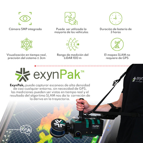 DESCRIPCIÓN ExynPak utiliza inteligencia artificial avanzada ExynPak es un escáner SLAM, ideal para levantamiento de túneles y labores subterráneas, medición de stockpiles, inspección, además de otras aplicaciones en minería y obras civiles. Diseñado para ofrecer flexibilidad, ExynPak registra la nube de puntos basado en la tecnología SLAM y puede adaptarse a prácticamente cualquier entorno de medición, capturando información en 360°. Con ExynPak, podremos realizar escaneos de alta densidad de casi cualquier entorno sin necesidad de GNSS. El resultado de la nube puntos y la trayectoria, pueden ser visualizadas en tiempo real y en forma precisa. CARACTERÍSTICAS ⨭ Cámara Integrada 5 MP ⨭ Se puede utilizar en la mayoría de los vehículos ⨭ Mapeo SLAM sin GNSS ⨭ Batería li-ion, 24v (6s), 3 horas de operación LiDAR ⨭ Clase de láser 1 ⨭ Campo de visión 360° horizontal ⨭ Máxima distancia 100 m ⨭ Puntos por segundo 600.000 ⨭ Precisión ±3 cm ⨭ Formatos de exportación las, ply, xyz TABLET ⨭ Pantalla 14” ⨭ IP 65 ⨭ Sistema operativo Linux (ubuntu 18.04) ⨭ Software interface Exynview™, control de la misión y flujo de datos en tiempo real. VIDEOS DESCARGAS DESCARGAR DATASHEET