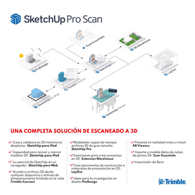 DESCRIPCIÓN SketchUp Pro Scan es la forma más accesible de trabajar con nubes de puntos en 3D. Con aplicaciones intuitivas 3D y 2D que funcionan con nubes de puntos, Pro Scan le ayuda a convertir los datos escaneados en visualizaciones dimensionales claras que todos puedan entender. Sólo para Windows. BENEFICIOS PRO SCAN Integración de nube de puntos Importe escaneos terrestres, fotogrametría, sensores LiDAR, mapeo móvil y capturas de drones como nubes de puntos y visualícelos en 3D. Modelado 3D intuitivo Modele con precisión sobre nubes de puntos utilizando las sencillas herramientas nativas de SketchUp. Cree modelos 3D precisos para proyectos profesionales. Modelador móvil Dibuje, edite y marque modelos 3D directamente en su iPad. Cree y colabore en 3D en la obra, oficina o sobre la marcha. Documentación 2D Dibuje, edite y marque modelos 3D directamente en su iPad. Cree y colabore en 3D en la obra, oficina o sobre la marcha. Colaboración en la nube Vincule datos de más de 60 herramientas de la industria y comparta los conjuntos de datos más recientes para que los proyectos se ejecuten según el calendario y el presupuesto previstos. Aplicaciones de visualización AR/VR Sumerja a los clientes en diseños 3D a escala 1:1 o en modo de sobremesa mediante aplicaciones de visualización de realidad mixta y realidad virtual. ESPECIFICACIONES ⨭ Crea y colabora en 3D mientras te desplazas (SketchUp para iPad) ⨭ Capacidad para revisar y marcar modelos 3D (SketchUp para iPad) ⨭ Lo esencial de SketchUp en un navegador (SketchUp para Web) ⨭ Accede a archivos 3D desde cualquier dispositivo y disfruta de almacenamiento ilimitado en la nube (Trimble Connect) ⨭ Modelador capaz de manejar archivos 3D de gran tamaño (SketchUp Pro) ⨭ Extensiones para crear proyectos en 3D (Extension Warehouse) ⨭ Crea documentos de construcción o materiales de presentación en 2D (LayOut) ⨭ Ideas para la investigación en diseño (PreDesign) ⨭ Presente en realidad mixta y virtual (XR Viewers) ⨭ Importe y modele datos de nubes de puntos 3D (Scan Essentials) ⨭ Importador de Revit VIDEOS DESCARGAS DESCARGAR DATASHEET