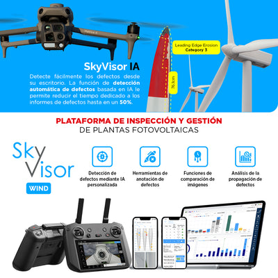 DESCRIPCIÓN SkyVisor Wind es una suite de software de vanguardia diseñada para automatizar y simplificar las inspecciones de aspas de aerogeneradores. En solo 18 minutos por turbina, esta herramienta todo en uno permite inspecciones rápidas y eficientes que apoyan las necesidades de mantenimiento diario, minimizando el tiempo de inactividad y reduciendo los costos operativos. Con tecnología de gemelo digital para una gestión mejorada de activos, SkyVisor ofrece vuelos de drones 100% autónomos, capturando datos de alta calidad mediante adquisición basada en drones y ayudándote a encontrar defectos rápidamente usando las potentes herramientas de IA de nuestra plataforma. ¡Toma el control del proceso de inspección hoy y optimiza la toma de decisiones con SkyVisor Wind para una gestión de activos proactiva y rentable! Áreas de Aplicación SkyVisor Wind sirve tanto a parques eólicos terrestres como marinos, adaptándose a turbinas de cualquier diámetro y fabricante. Ya sea inspeccionando aspas o torres de turbinas, nuestra solución proporciona inspecciones rápidas, precisas y automatizadas, permitiéndote gestionar el mantenimiento de manera proactiva y eficiente. Tu Suite de Software Todo en Uno SkyVisor proporciona una suite de software integrada diseñada para la recolección automática y eficiente de datos, resolución colaborativa de problemas y gestión integral de activos. La App de Dron, App de Campo y Plataforma Web trabajan en perfecta armonía para optimizar tus inspecciones de aerogeneradores y el rendimiento de los activos: App de Dron SkyVisor: Captura datos visuales de alta resolución con vuelos autónomos de drones, permitiendo una inspección rápida y precisa, incluso en condiciones desafiantes. Plataforma Web SkyVisor: Planifica inspecciones, rastrea actividades de mantenimiento y genera informes desde una plataforma centralizada impulsada por herramientas de detección de defectos basadas en IA. App de Campo SkyVisor: Empodera a tus equipos con acceso instantáneo a datos, hilos de compartición de archivos e imágenes, asegurando una respuesta rápida y colaboración eficiente para resolver problemas en el sitio. CARACTERÍSTICAS SkyVisor Wind Solución In-House: solución de inspección interna que devuelve el control a tu equipo Vuelo eficiente de 18 minutos por turbina: inspección rápida y optimizada Operación Totalmente Autónoma: inspección automática que garantiza un tiempo mínimo de inactividad y máxima seguridad Datos de Alta Resolución: adquisición de 120 imágenes de alta calidad por aspa, proporcionando datos visuales completos para una detección y análisis preciso de defectos Cumplimiento con Estándares de la Industria: inspección industrial bajo el estándar IEC adaptable a diversos modelos y especificaciones de turbinas Impulsado por IA: herramientas avanzadas de detección de defectos basadas en Inteligencia Artificial. Un asistente digital experto en aspas, que permitirá detectar defectos de manera más rápida y eficiente Informes Optimizados: Genera sin esfuerzo informes digitales detallados y compartibles para una comunicación fluida con las partes interesadas VIDEOS DESCARGAS Descargar Datasheet
