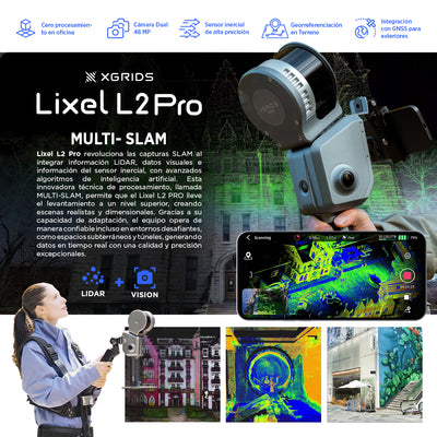 DESCRIPCIÓN Lixel L2 Pro representa la solución más avanzada en tecnología de escaneo 3D portátil basada en la tecnología MULTI-SLAM . Este dispositivo combina alta precisión, portabilidad y un diseño integrado todo en uno, ofreciendo un flujo de trabajo eficiente, desde la captura de datos hasta la reconstrucción 3D de nube de puntos en tiempo real. CARACTERÍSTICAS MULTI-SLAM Lixel L2 Pro revoluciona las capturas SLAM al integrar información LiDAR, datos visuales e información del sensor inercial, con avanzados algoritmos de inteligencia artificial. Esta innovadora técnica de procesamiento, llamada MULTI-SLAM, permite que el Lixel L2 PRO lleve el levantamiento a un nivel superior, creando escenas realistas y dimensionales. Gracias a su capacidad de adaptación, el equipo opera de manera confiable incluso en entornos desafiantes, como espacios subterráneos y túneles, generando datos en tiempo real con una calidad y precisión excepcionales. CERO PROCESAMIENTO EN OFICINA Lixel L2 Pro no solo ofrece datos de alta precisión mediante posprocesamiento tradicional, sino que revoluciona la eficiencia en terreno, al entregar resultados en tiempo real, listos para exportar y analizar. Destaca por su diseño compacto, fácil de usar y altamente optimizado, Lixel L2 Pro es una gran herramienta para profesionales que buscan confianza y productividad en un solo dispositivo. georreferenciar nube NUBE DE PUNTOS CON CALIDAD FOTOGRÁFICA Gracias al exclusivo algoritmo LixelUpSampleTM desarrollado por Xgrids, la nube de puntos resultante se optimiza significativamente reduciendo el ruido hasta aproximadamente 5 mm tras el pos procesamiento. Además, la matriz de distribución de los puntos se organiza de manera uniforme, garantizando una representación más precisa y homogénea. LIXELSTUDIO LixelStudio es un software avanzado de procesamiento de nubes de puntos, potenciado por algoritmos SLAM de última generación. Ofrece reconstrucciones 3D de nubes de puntos con un alto nivel de precisión y calidad. Además, proporciona herramientas completas para visualizar, editar y procesar nubes de puntos LiDAR, integrando complementos específicos adaptados a diversas industrias. Con capacidades avanzadas de inteligencia artificial, LixelStudio optimiza la eficiencia en el procesamiento de datos y mejora significativamente la productividad, brindando soluciones innovadoras a los desafíos del análisis espacial. LIXELGO La aplicación de campo Lixel Go destaca por su flujo de trabajo intuitivo y altamente eficiente. Diseñada para controlar la serie de equipos Xgrids desde una única interfaz, permite realizar operaciones con un solo clic. Con esta herramienta, es posible configurar flujos de trabajo, gestionar escaneos, monitorear el estado de la batería, la conectividad y la capacidad de memoria, además de administrar los datos capturados con precisión mediante GNSS. Visualice en tiempo real los datos obtenidos, incluyendo información LiDAR, imágenes y nubes de puntos en color verdadero. Todo está diseñado para maximizar el rendimiento y la precisión en tus proyectos de campo. ⨭ Sistema MULTI-SLAM ⨭ Cero procesamiento en oficina ⨭ Cámara Dual 48 MP ⨭ Sensor inercial de alta precisión ⨭ Georreferenciación en Terreno ⨭ Integración con GNSS para exteriores VIDEOS DESCARGAS DESCARGAR DATASHEET